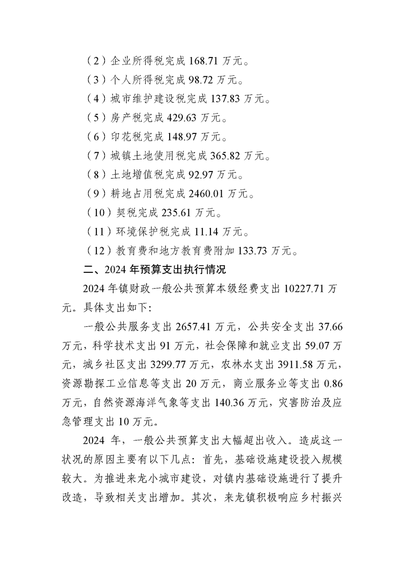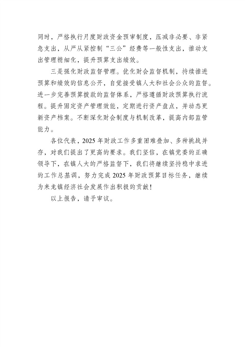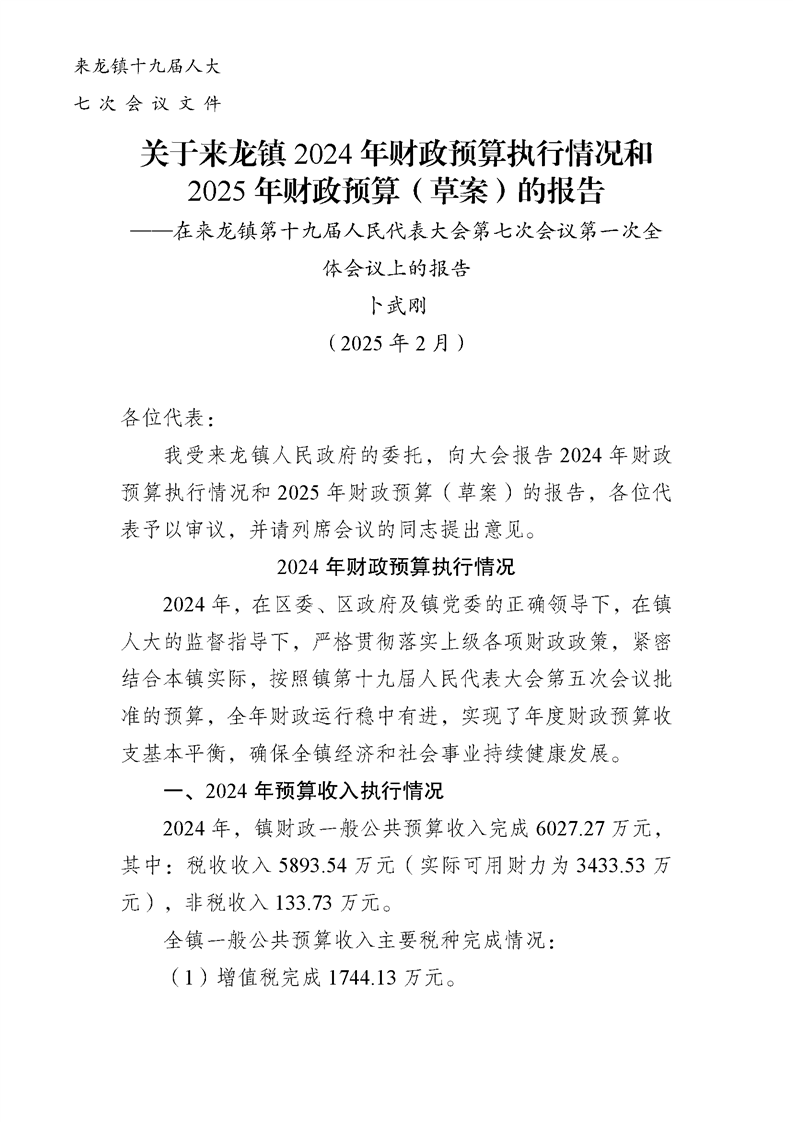 關于來龍鎮2024年財政預算執行情況和2025年財政預算(草案)的報告