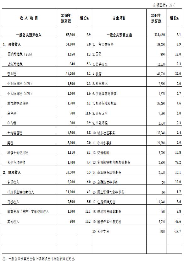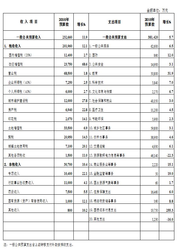 2016年全區一般公共預算收支情況表