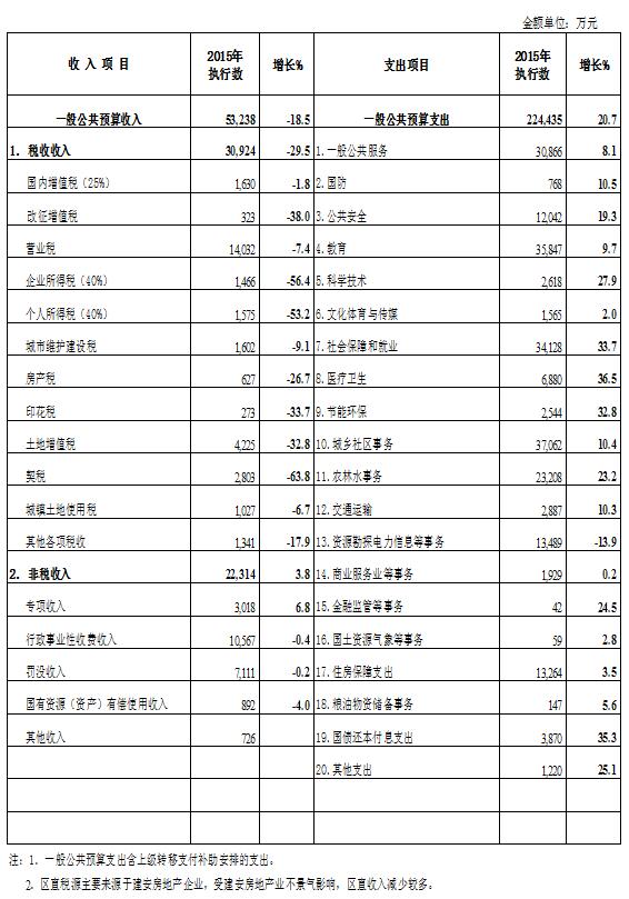 2015年,全區預計完成一般公共預算支出39.53億元,完成年度調整預算的98.2%,增長18%。