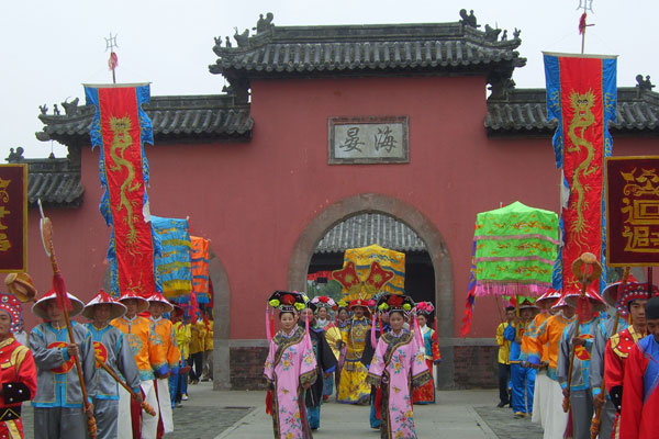 該廟會起源于明孝帝弘治八年(1495年),后經康熙、乾隆皇帝南巡數次駐蹕于此,使龍王廟會更是名聲大振。每年屆時都有眾多善男信女,紛紛前來燒香拜佛,祈福求祥。山東、河南、安徽幾省相鄰的行商坐賈、民間藝人也紛至沓來,云集皂河。一時間逛廟的、敬神的、看景的、購物的熱鬧非凡,“木刀木劍紅纓槍,桃猴玉兔青竹蟒,剪紙雕刻撥浪鼓,糖人泥哨小花棒”應有盡有。這其中初八為“焰火日”,晚上在龍王廟西側廣場燃放各種煙花、爆竹,夜景壯觀;初九為“正祭日”,在龍王殿的月臺廣場設祭臺正祭,祭祀時,樂隊演奏祭祀曲,祭祀者上臺叩頭祭拜,整日經聲不絕,香煙燎繞;初十為“朝山日”,“四山盛會”伴朝鑾駕儀仗游廟活動,以求神靈消除水患。所有逛廟會的人們一起參拜龍王,人山人海,盛況空前,被列為江蘇蘇北地區36處香火盛會之首。數百年來,歲歲如此,從未間斷過,可稱得上一大民俗奇觀。