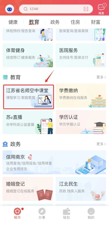 3、入口三:在省內(nèi)各設(shè)區(qū)市公共服務(wù)APP中找到“江蘇省名師空中課堂”版塊進入(以“我的南京”為例)。