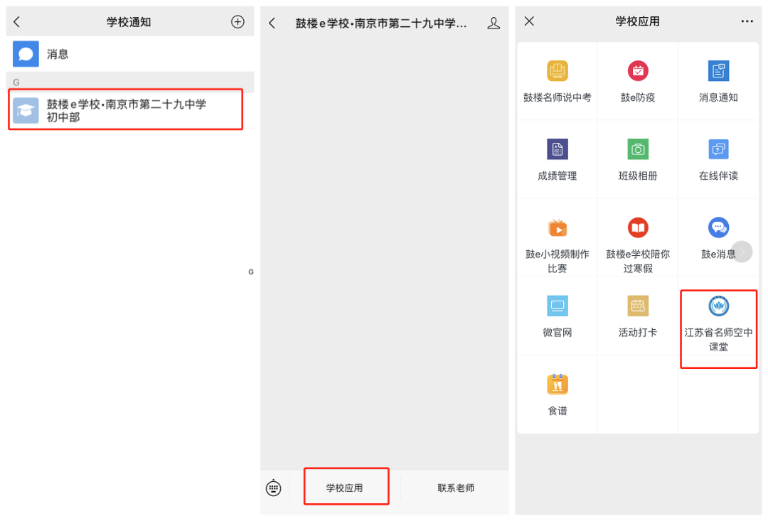 2、入口二:微信-通訊錄-我的企業(yè)-學(xué)校通知-所屬學(xué)校(以“南京市第二十九中學(xué)初中部”為例)-學(xué)校應(yīng)用-【江蘇省名師空中課堂】。